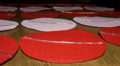 - Cut 4 x 1/2 inch strips of felt to hot glue OVER the wire…(this keeps the wire from showing when you fold your cookies as you will be able to slightly see the center)