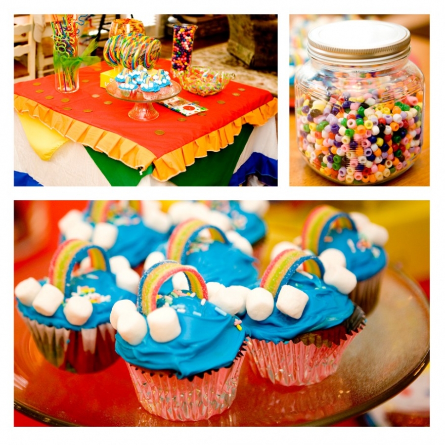 A rainbow candy favor station (I know the moms probably loved this–hee, hee…and their dentists too;) They made colorful necklaces for a craft. And the cupcakes were multi-colored inside (seperate the batter in 4 bowls and use food coloring or food coloring gel to color each one). Then you dye the icing, add marshmellows for clouds, sour striped strips for the rainbow…and a few sprinkles for a magic touch!