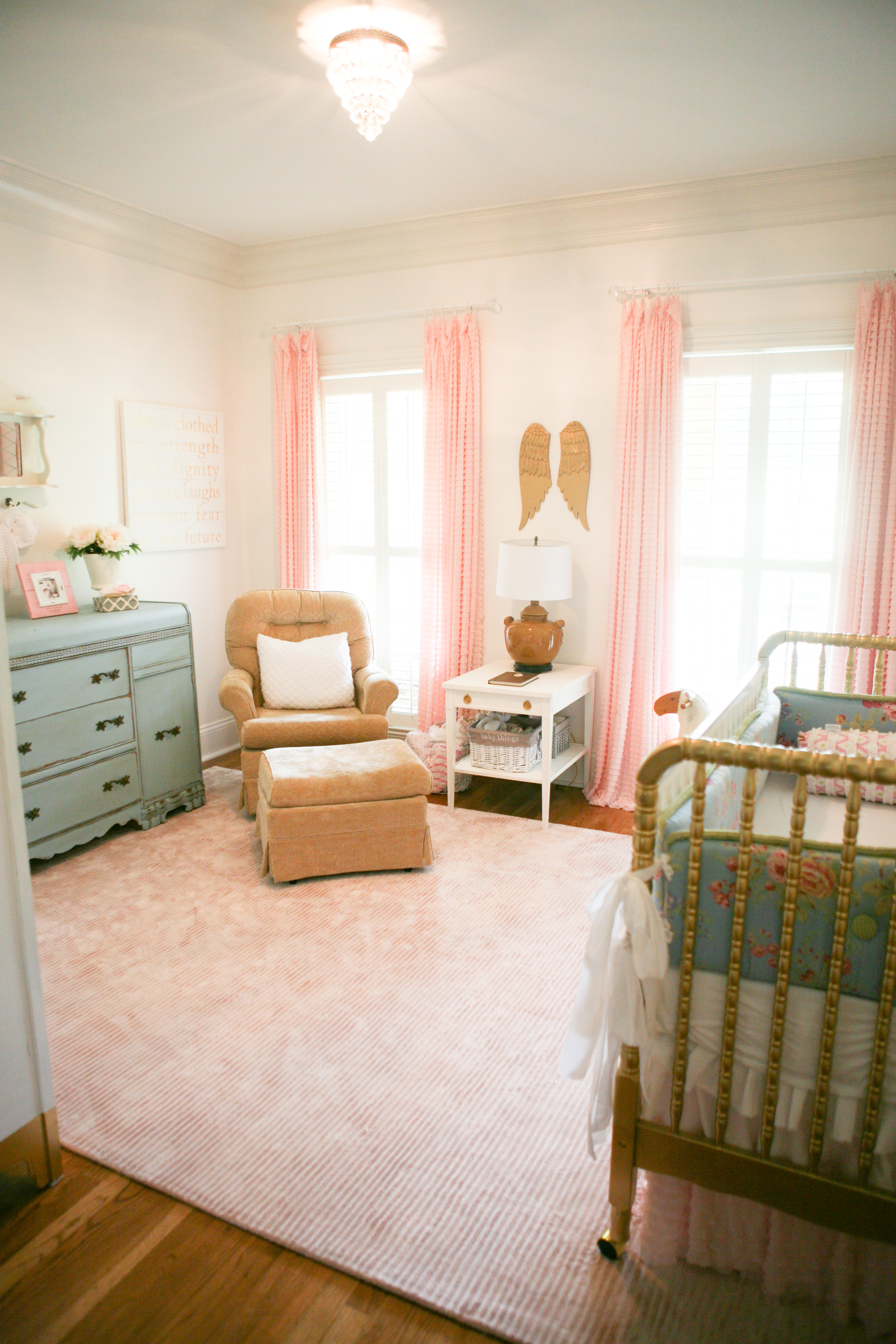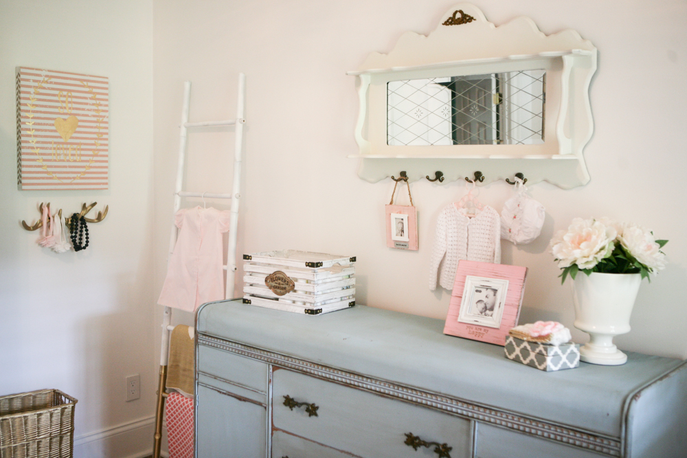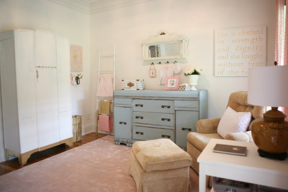 The space where the 1950s sideboard (turned into a dresser) is was a wide opening to foyer before we closed it in a couple of months ago. I found the sideboard at an antique store, and it was already painted light blue. The white antique mirror above the sideboard I found 12 years ago at an antique shop. It was brown and I painted it white for my 12 year old’s room when he was a baby. It’s seen all 5 nurseries and now makes it’s way to the 6th. The rocker was bought for only other princess’s nursery and it 10 years old–but it’ll do and has held up well:)