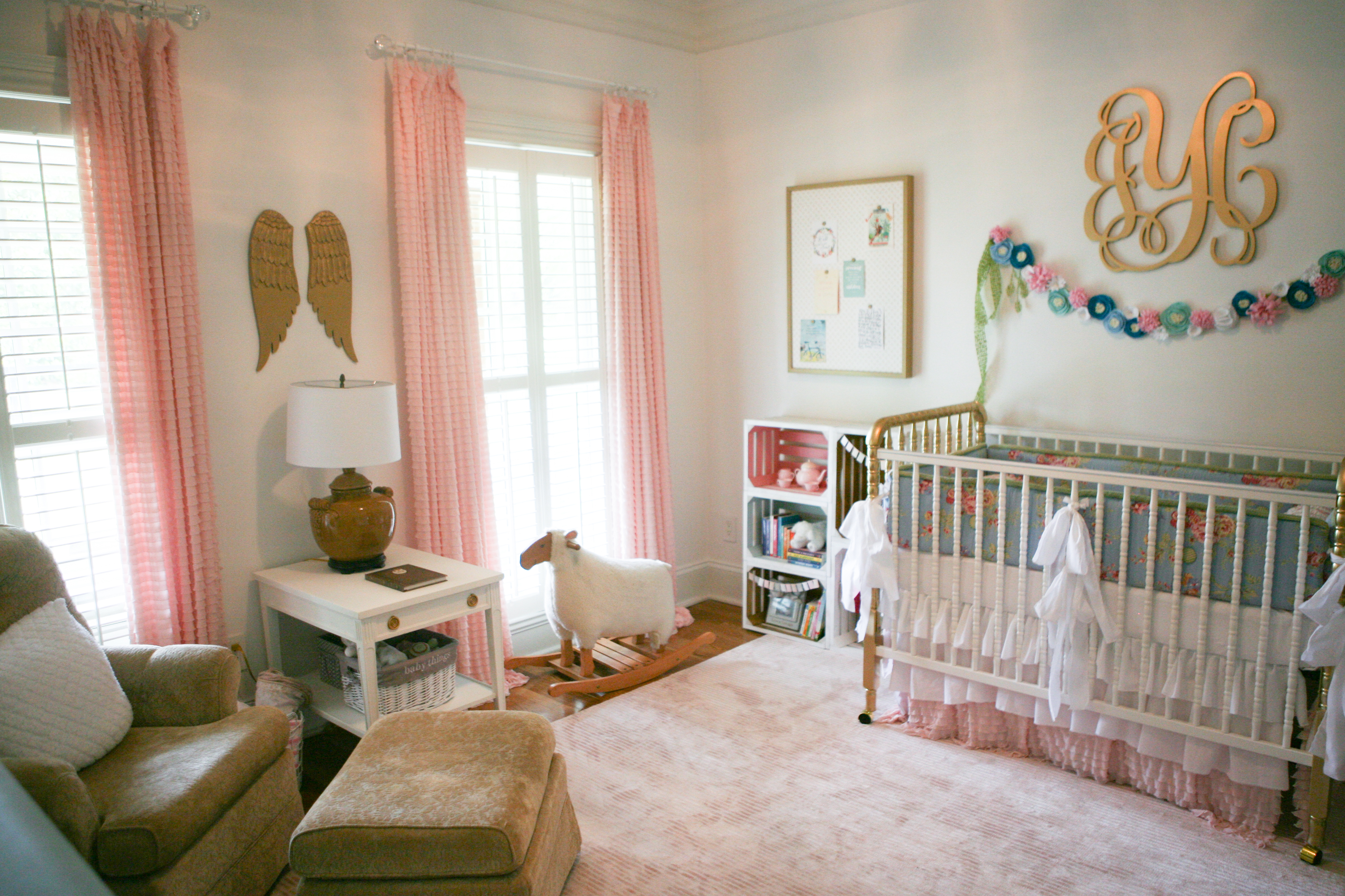 I wanted lots of vintage pink, gold and white–and when I spotted gold angel wings in a Restoration Baby & Child catalog I had to have! Only not for hundreds of $$;). I found some on Etsy for $200 but that was still more than I wanted to pay. So I settled for white ones on Amazon for $35 and just spray painted them gold myself;).