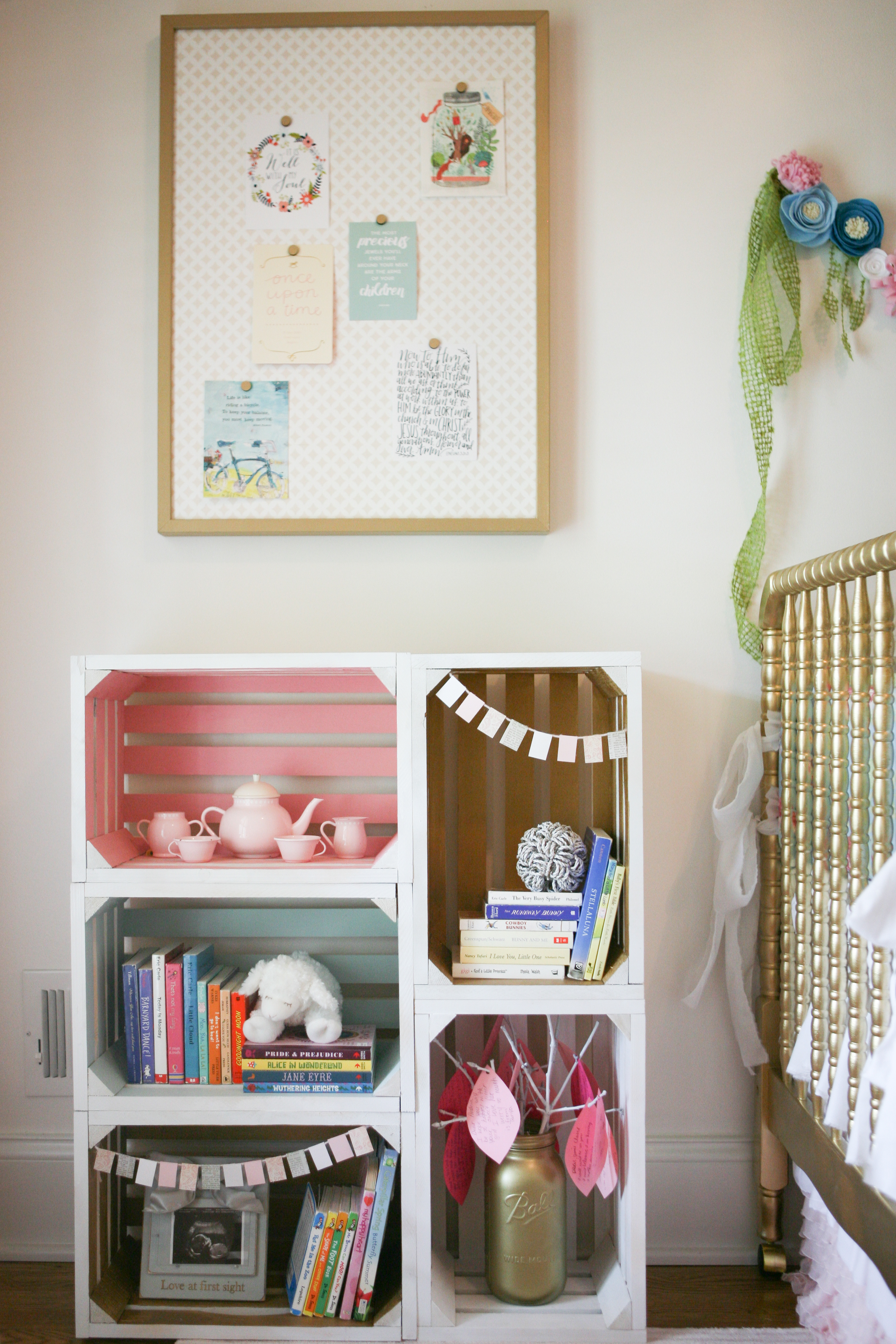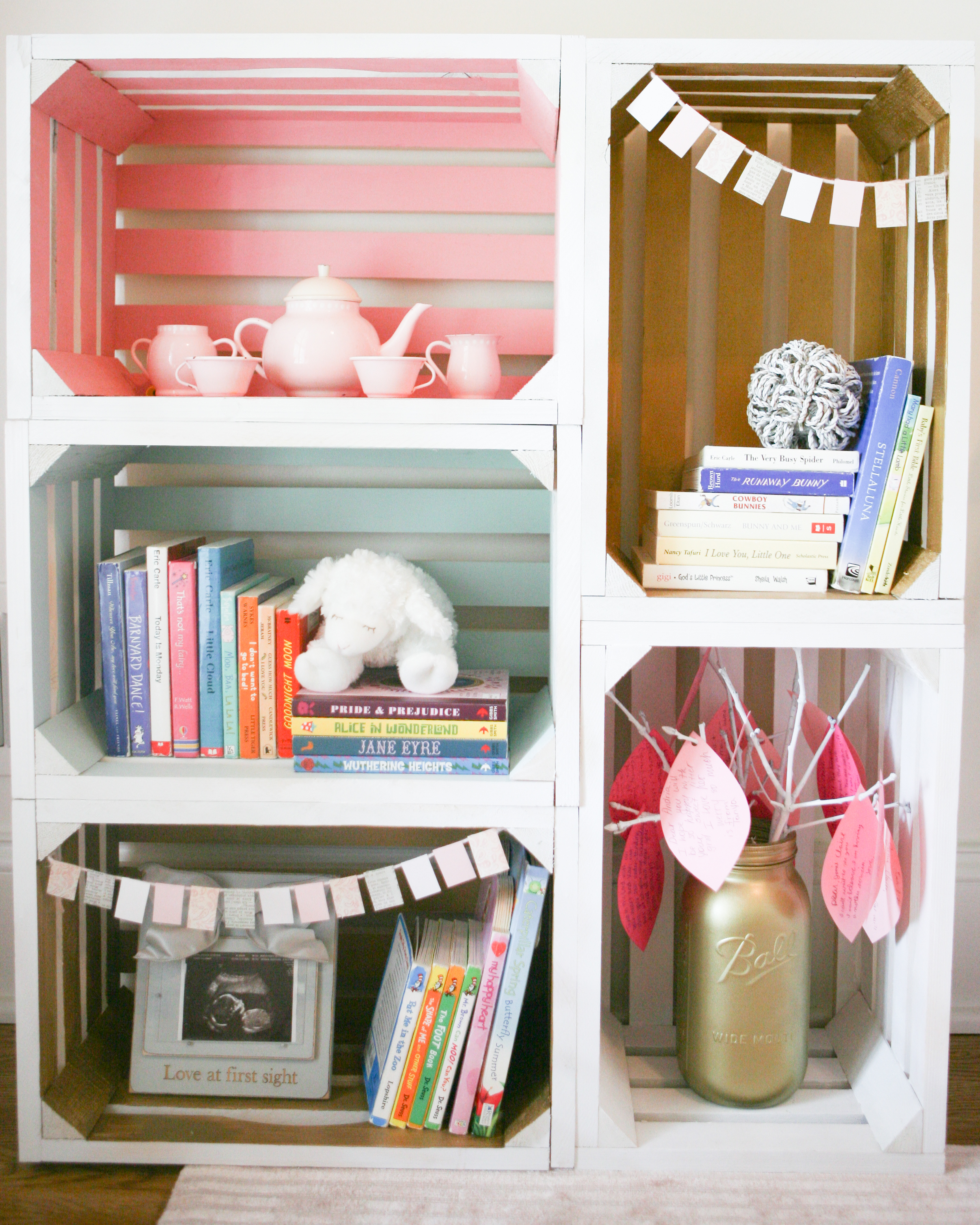 Big sister wanted to be a part of most everything…I guess with 4 brothers she’s dreamed of a sister forever:). We made baby girl a little bookshelf out of wooden crates we bought at Walmart. We spray painted each one white with a flat white spray paint and then used screws to attach them together. We used acrylic paint we already had to paint the inside of each one in different shades.