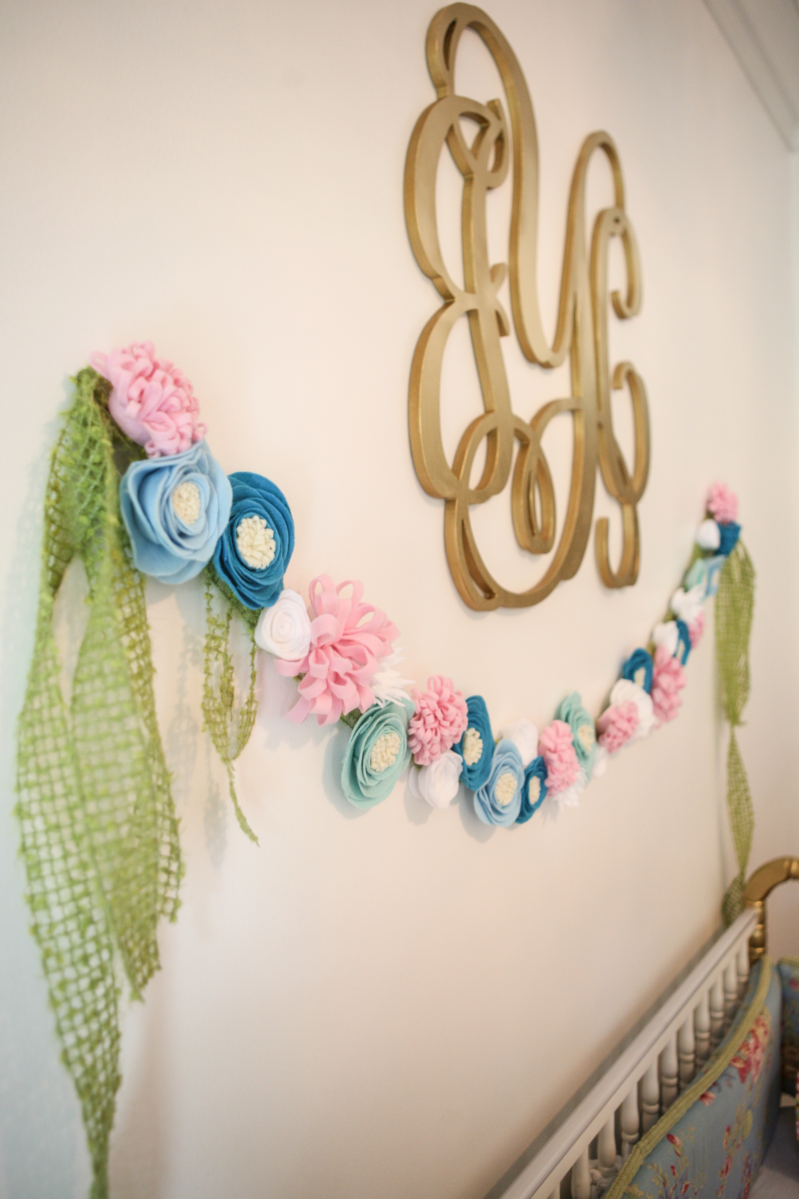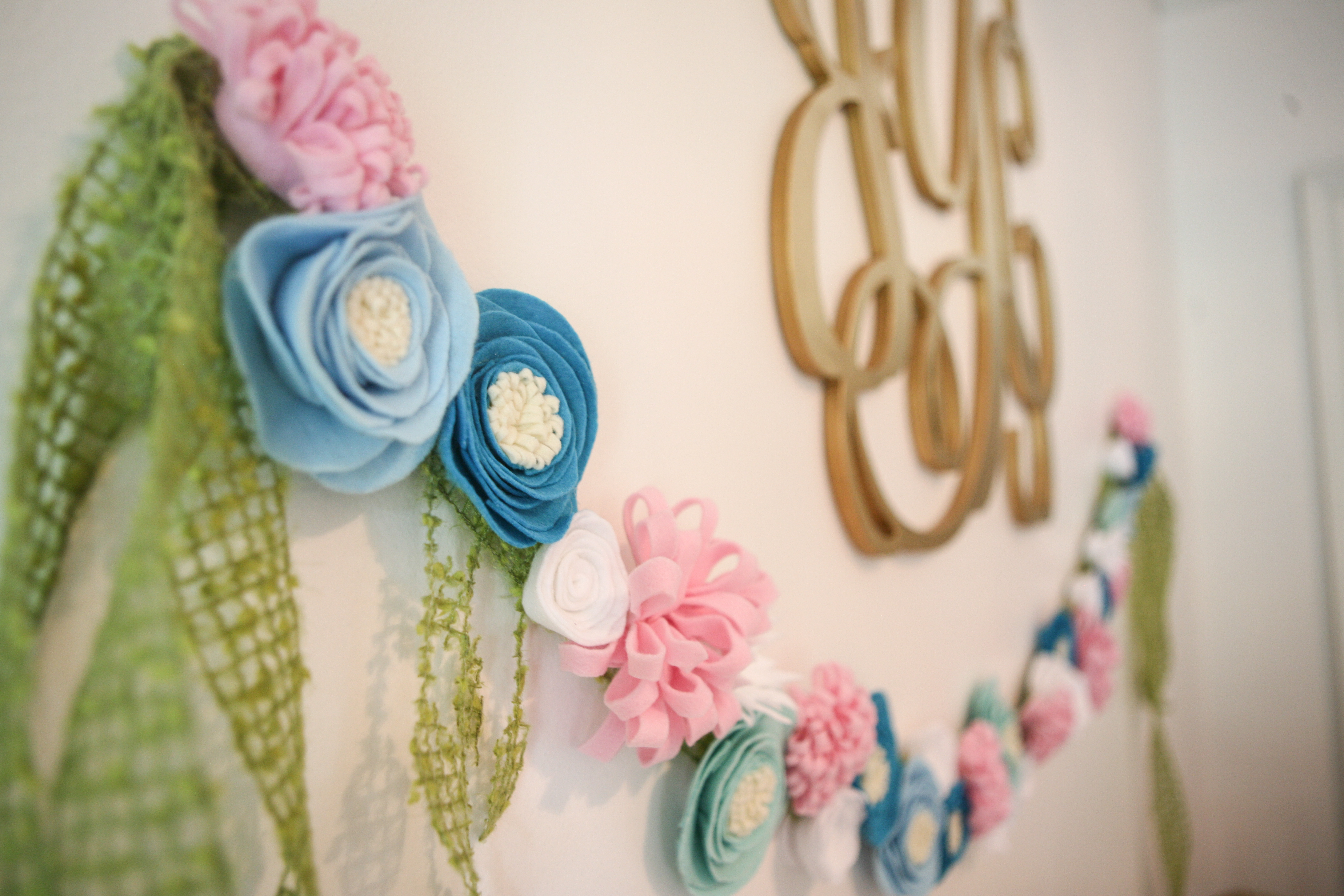 My daughter and I made the flower banner out of felt! I found some on Etsy for $90 but they weren’t even as full as this. So we put our heads together and made a craft day out of it and made this one for closer to $15 including all felt and the floral ribbon we hot-glued them to.