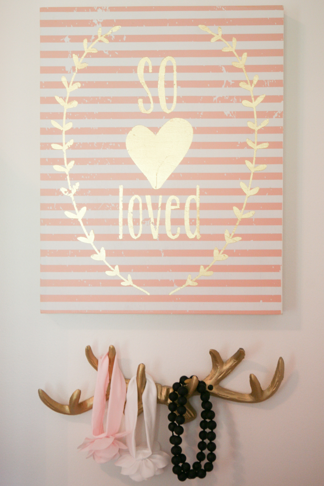 And my most precious babysitter and her soul-sister momma friend of mine gave our sweet baby this Hobby Lobby find…SO LOVED…yes she is already:) I found the gold antlers for hanging pretties at HomeGoods…