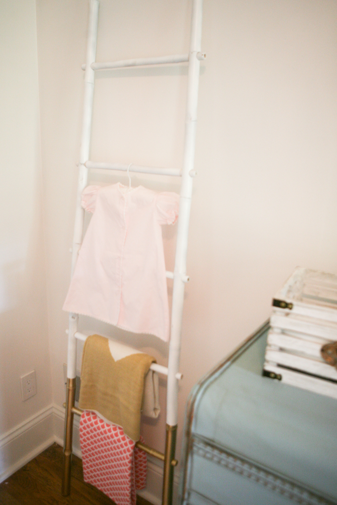 We already had the laundry basket…and I was on a gold frenzy–so I spray painted that gold also;). I found a 72″ bamboo ladder on Amazon and spray painted it a flat white–then I went back using painters tape and gave it a little gold dip too:)