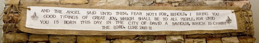 I think we’ll actually move the nativity to another table–but I thought it was fun under the verse until I make the wreath that will go under it–between the toparies. Also–I tried a decorative stamp I already had on each ends just for a different look. I like it both ways…here is what a banner looks like without them and just hanging above a doorway (the way we hung them for the babies’ dedications)…